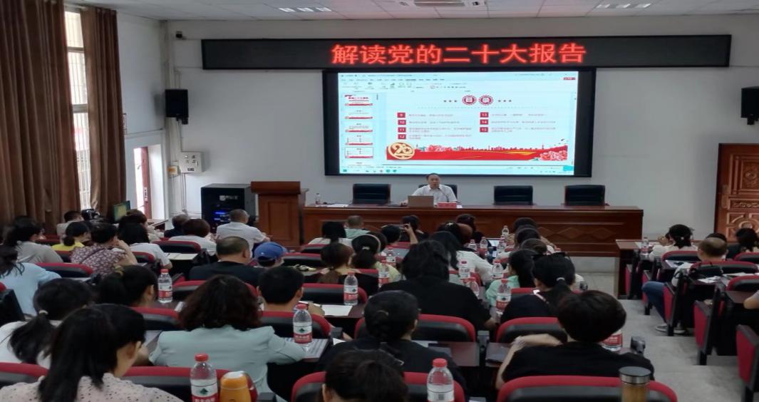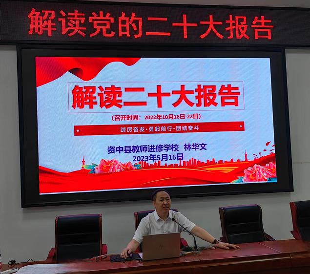 为贯彻落实《教育部关于进一步加强新时代中小学思政课建设的意见》精神, 深刻领悟“两个确立”,增强“四个意识”,坚定“四个自信”,用习近平新时代中国特色社会主义思想铸魂育人。5月16日,MK网官方站网页版资中分校党总支书记、校长林华文在阶梯教室作题为《解读党的二十报告》的专题讲座,全体教职员工和来自已挂牌的社区学校、城区社区学习中心的分管领导、网格员到场聆听。