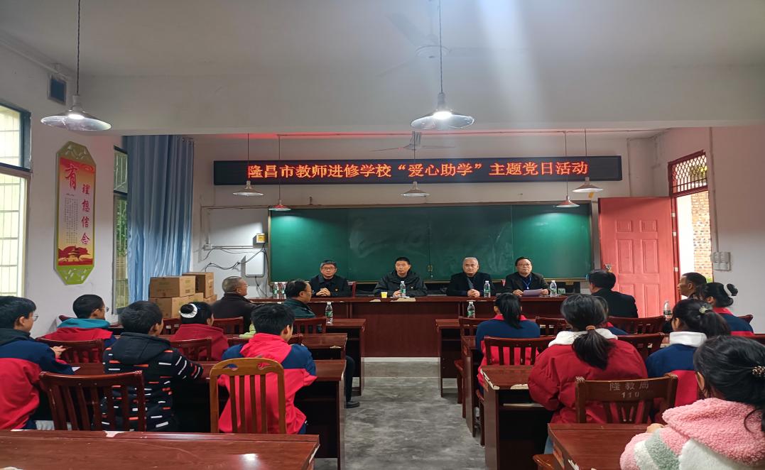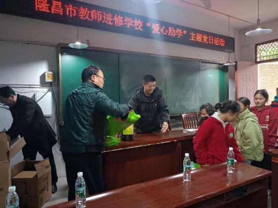 为深入学习贯彻党的二十大精神及习近平新时代中国特色社会主义思想,落实习总书记关于关心下一代工作的重要指示批示精神,弘扬中华民族扶危济困的美德。2023年11月17日下午,隆昌市教师进修学校、内江开大隆昌分校党支部组织全体党员到响石镇前锋中学举行了“不忘初心育桃李,实干担当办实事”慰问贫困学生主题党日活动。 主持人前锋中学校长苏建坤介绍参加本次活动的相关人员后,隆昌市教师进修学校、内江开大隆昌分校支部书记陈仕坤同志致辞,他鼓励孩子们要以积极乐观的心态面对困难,努力学习,发挥特长,将来以优异的成绩回报社会。 随后,党员们向同学们送上了生活用品及学习用品。希望各位同学要珍惜时光、抓住学习机会,学有所成,也要常怀感恩之心,将爱心善举薪火相传。