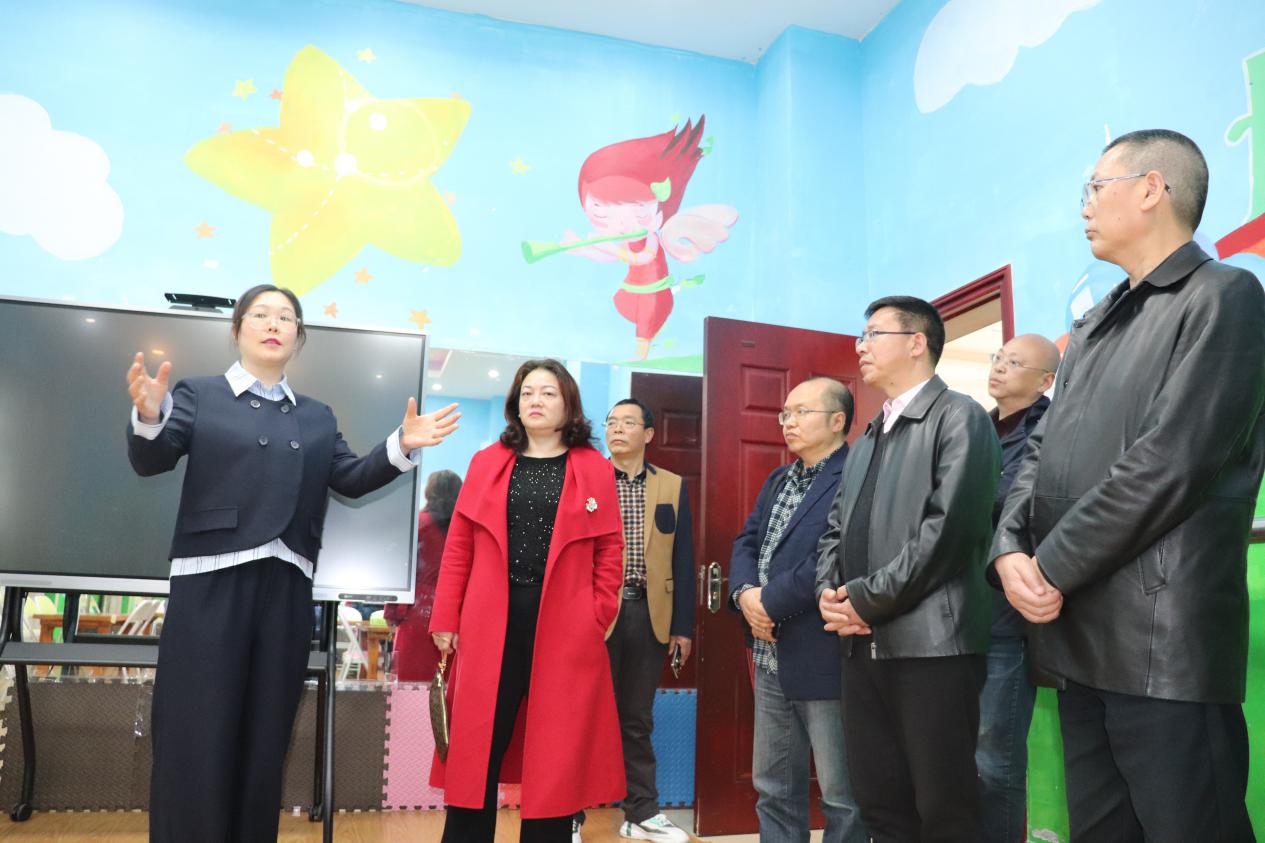 周东华(左一)介绍五星社区 当天下午,黔江区教委和黔江电大一行首先到东兴区五星社区教育学习中心考察调研。参观了其社区教育硬软件建设情况,五星社区教育学习中心负责人介绍了社区教育开展的概况,特别是针对社区“一老一小”组织的社区教育活动以及社区教育“家校社”联动的主要做法和取得的成效。黔江区教委和黔江电大一行针对社区教育多项工作重点和细节问题,与五星社区教育学习中心负责人进行了深入交流。 在随后召开的座谈会上,双方业务科室负责人分别介绍了各自的业务开展情况,并就共同关心的热点、难点问题,现场进行了热烈的互动交流。